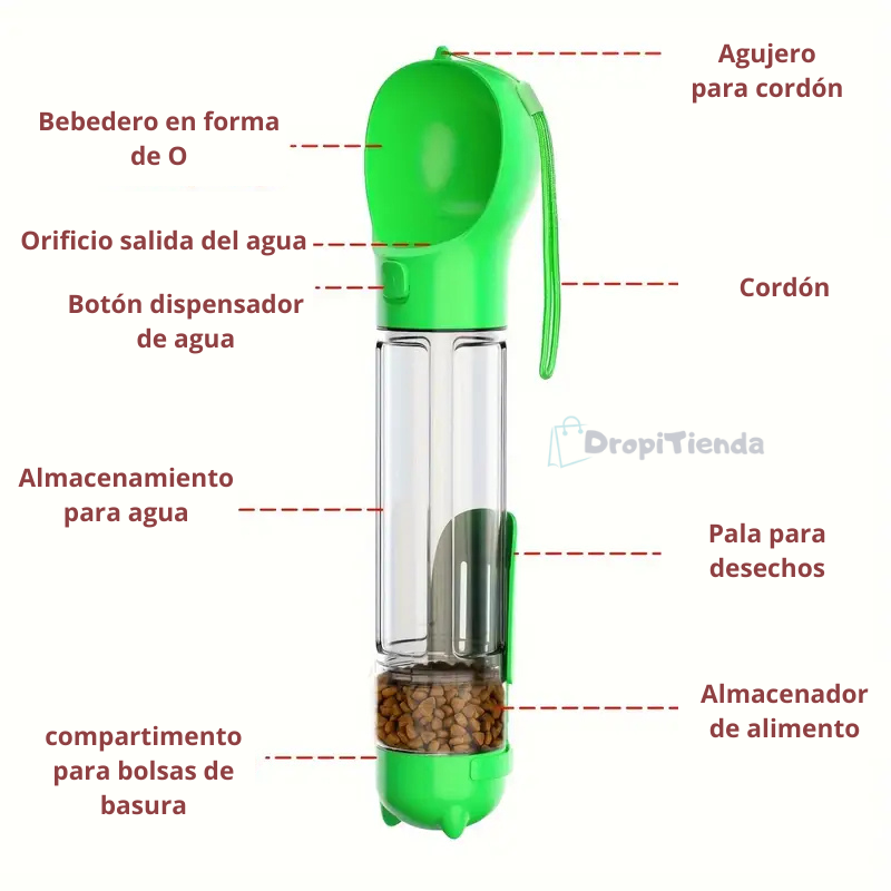 Pero eso no es todo. Su diseño innovador permite liberar agua con un solo toque y detenerla con otro, todo con una sola mano. Además, es más que un simple dispensador: cuenta con una pala para recoger desechos, espacio para almacenar agua y comida, y una estructura resistente a la corrosión, ideal para cualquier aventura. ¡Durabilidad y funcionalidad en un solo producto!